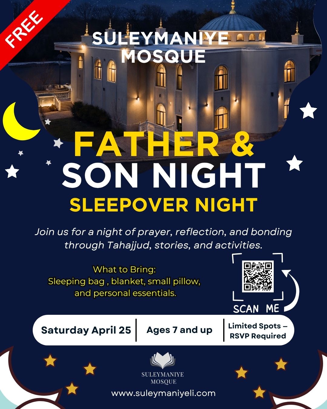 This unique overnight experience at the masjid will include Tahajjud and Fajr salah, engaging activities, and uplifting reminders, all designed to bring families closer through faith and shared moments. Itβs more than just a night β itβs an experience focused on connection, reflection, and brotherhood.